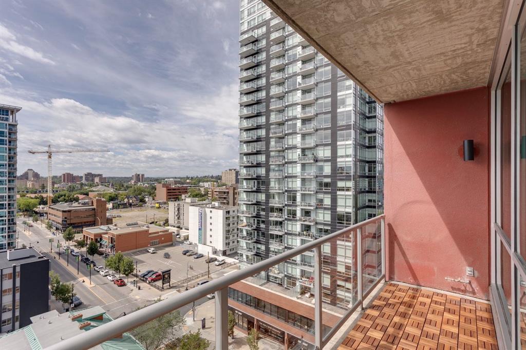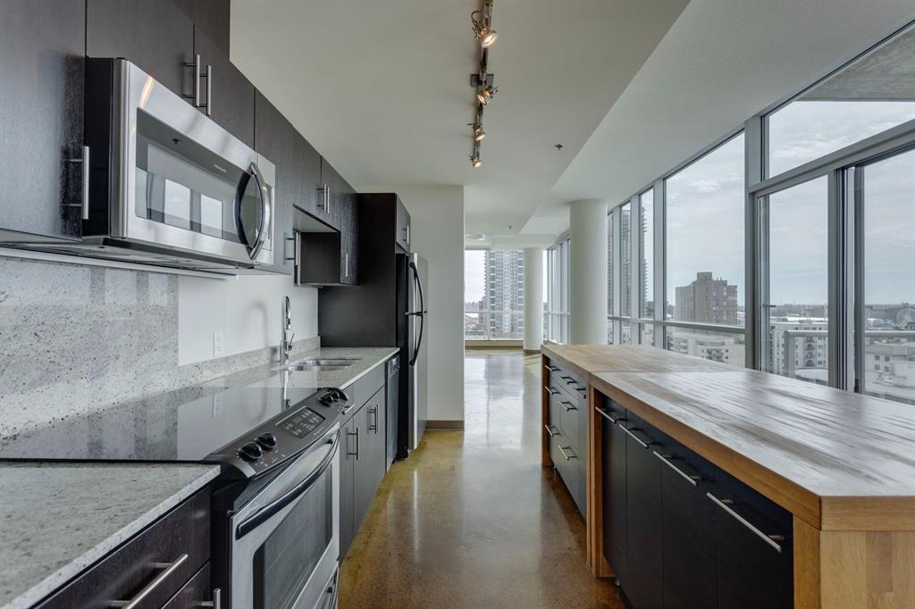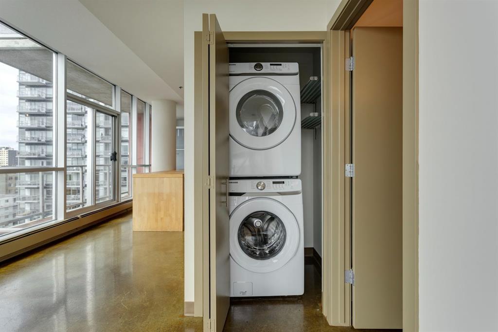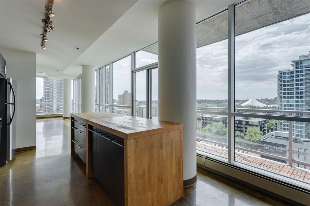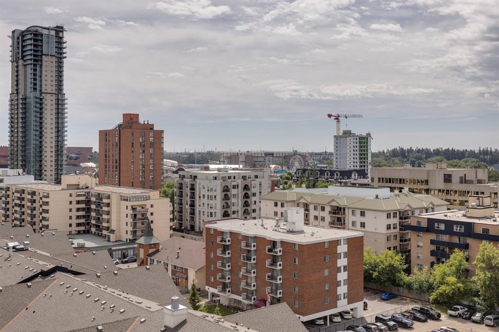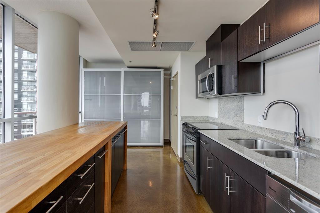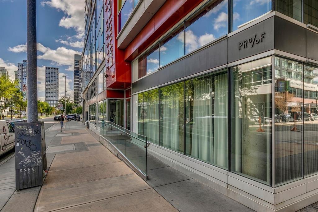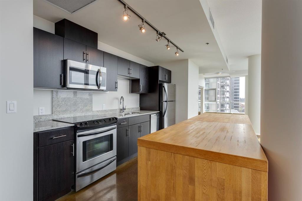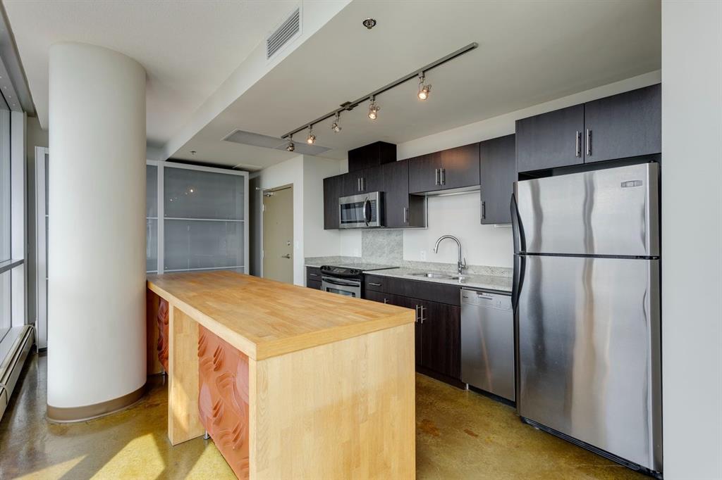 Discover downtown living at its best in this standout 1 bed/1 bath corner unit in Colours by Battistella, a striking high-rise known for its modern architecture and prime location. This unit delivers on space, style, and one of the most spectacular views in the city. Boasting floor-to-ceiling windows along two full walls, this home offers incredible 180 degree views of Stampede Park and the Rocky Mountains, filling the space with natural light all day long. The open concept layout creates a bright, airy feel, ideal for both everyday living and entertaining. The contemporary kitchen features granite countertops, stainless steel appliances, including a Miele dishwasher, and a central island with a butcher block countertop, blending form and function seamlessly. The kitchen flows effortlessly into the living and dining area, leading to a private balcony where you can enjoy morning coffee or evening relaxing with cityscape views. The spacious primary bedroom is framed by urban vistas and modern exposed concrete accents, adding a touch of industrial flair. A custom built-in storage unit enhances both style and functionality, while the walk-in closet adds generous storage space. The sleek and modern 4pc bathroom is conveniently located just steps from the bedroom. Additional features include in-suite laundry, titled underground parking, and secure building access. Located in the vibrant Beltline, you’re just steps from 17th Ave, 10th Ave, Stampede Park, top rated restaurants, cafes, shops, nightlife, and transit. Whether you’re a first time buyer, urban professional, or investor, this unit offers unmatched downtown lifestyle and value.