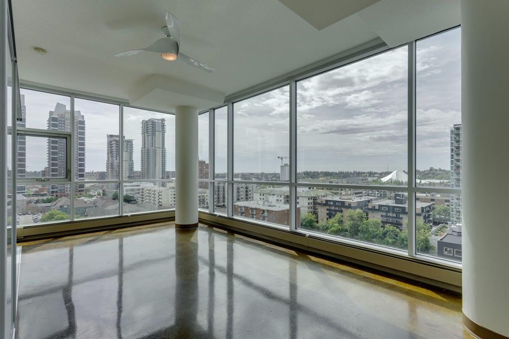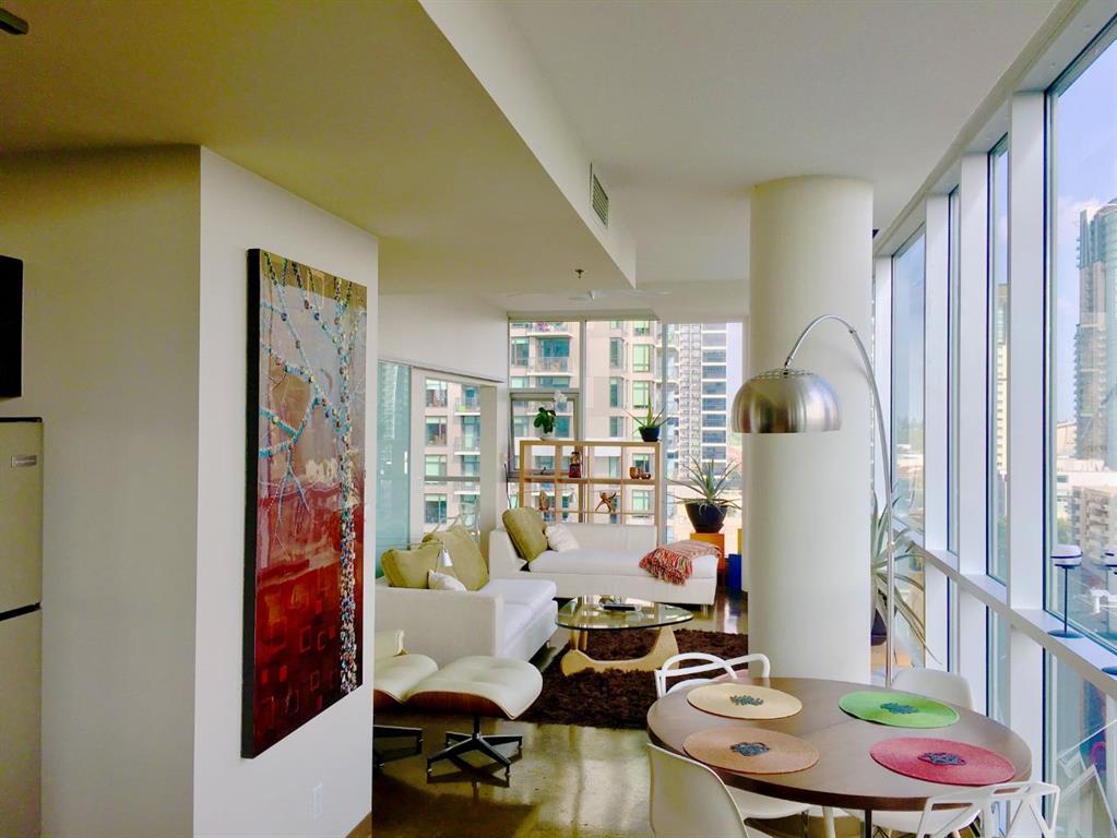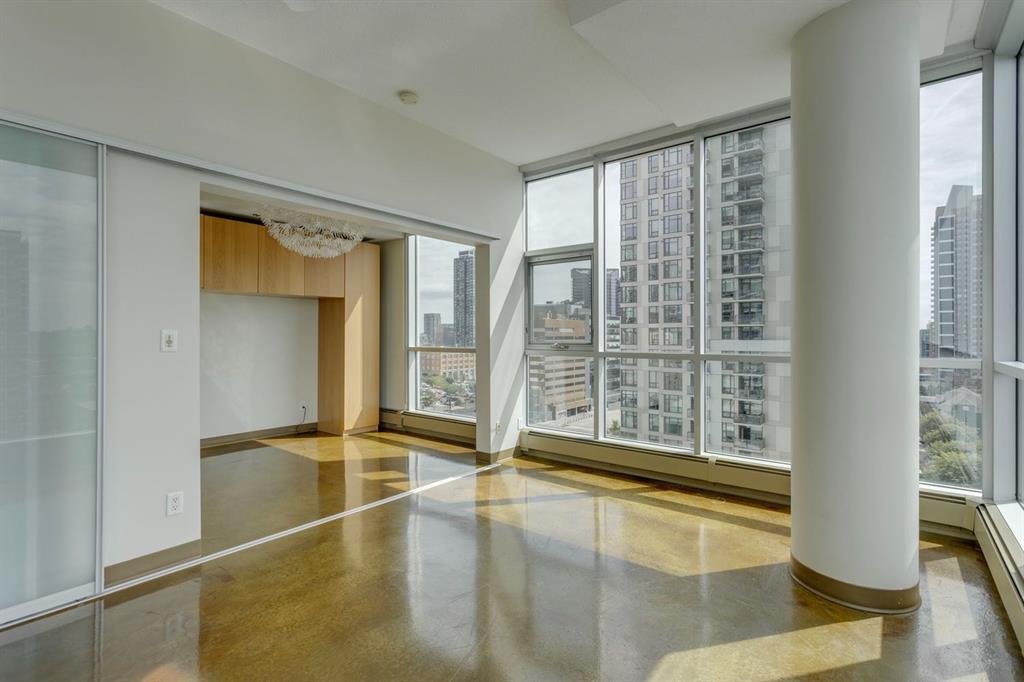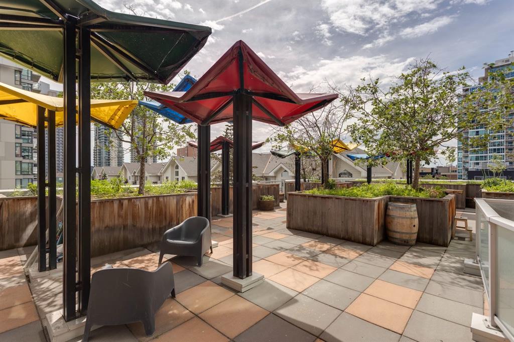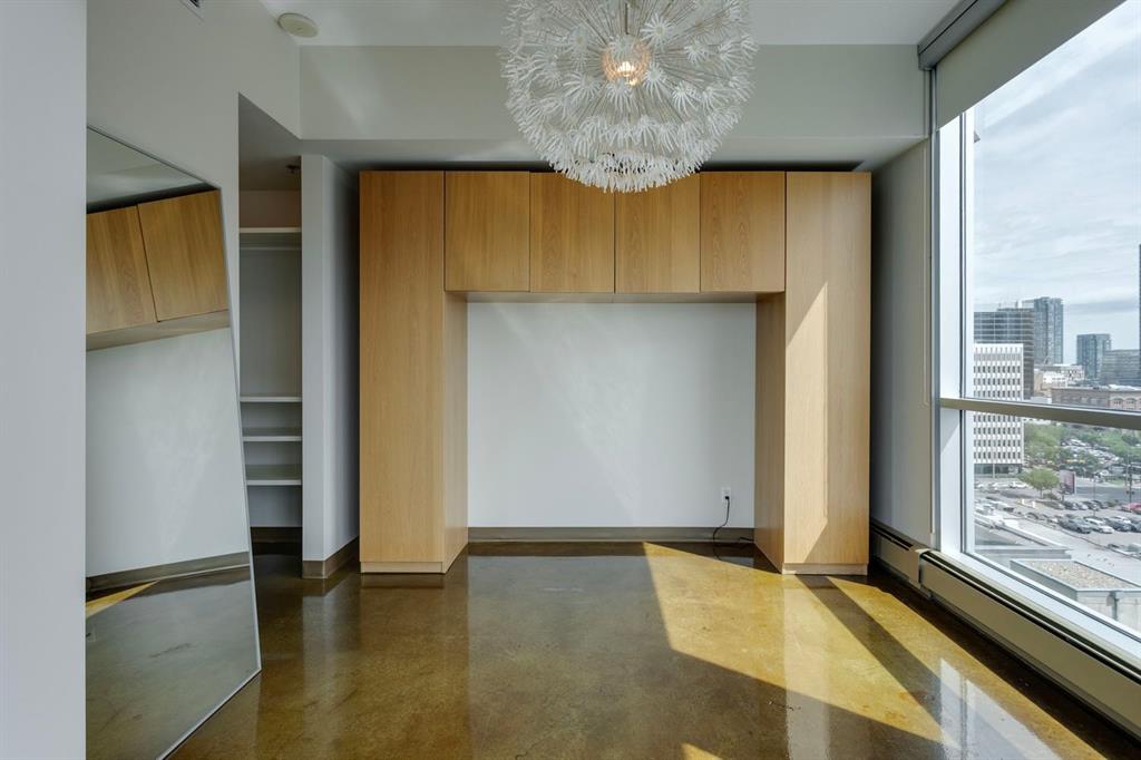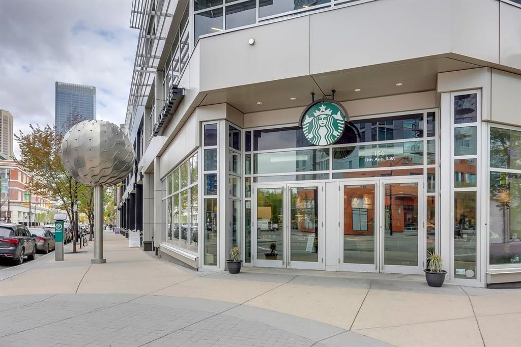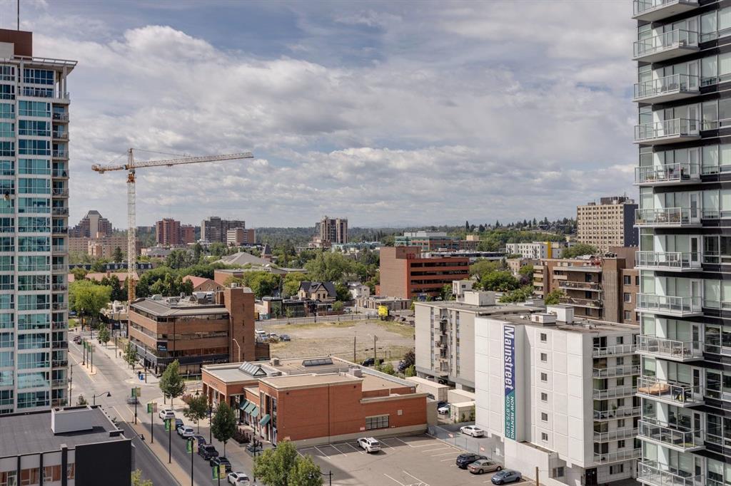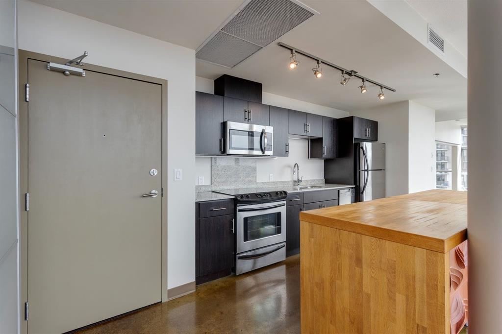 Discover downtown living at its best in this standout 1 bed/1 bath corner unit in Colours by Battistella, a striking high-rise known for its modern architecture and prime location. This unit delivers on space, style, and one of the most spectacular views in the city. Boasting floor-to-ceiling windows along two full walls, this home offers incredible 180 degree views of Stampede Park and the Rocky Mountains, filling the space with natural light all day long. The open concept layout creates a bright, airy feel, ideal for both everyday living and entertaining. The contemporary kitchen features granite countertops, stainless steel appliances, including a Miele dishwasher, and a central island with a butcher block countertop, blending form and function seamlessly. The kitchen flows effortlessly into the living and dining area, leading to a private balcony where you can enjoy morning coffee or evening relaxing with cityscape views. The spacious primary bedroom is framed by urban vistas and modern exposed concrete accents, adding a touch of industrial flair. A custom built-in storage unit enhances both style and functionality, while the walk-in closet adds generous storage space. The sleek and modern 4pc bathroom is conveniently located just steps from the bedroom. Additional features include in-suite laundry, titled underground parking, and secure building access. Located in the vibrant Beltline, you’re just steps from 17th Ave, 10th Ave, Stampede Park, top rated restaurants, cafes, shops, nightlife, and transit. Whether you’re a first time buyer, urban professional, or investor, this unit offers unmatched downtown lifestyle and value.