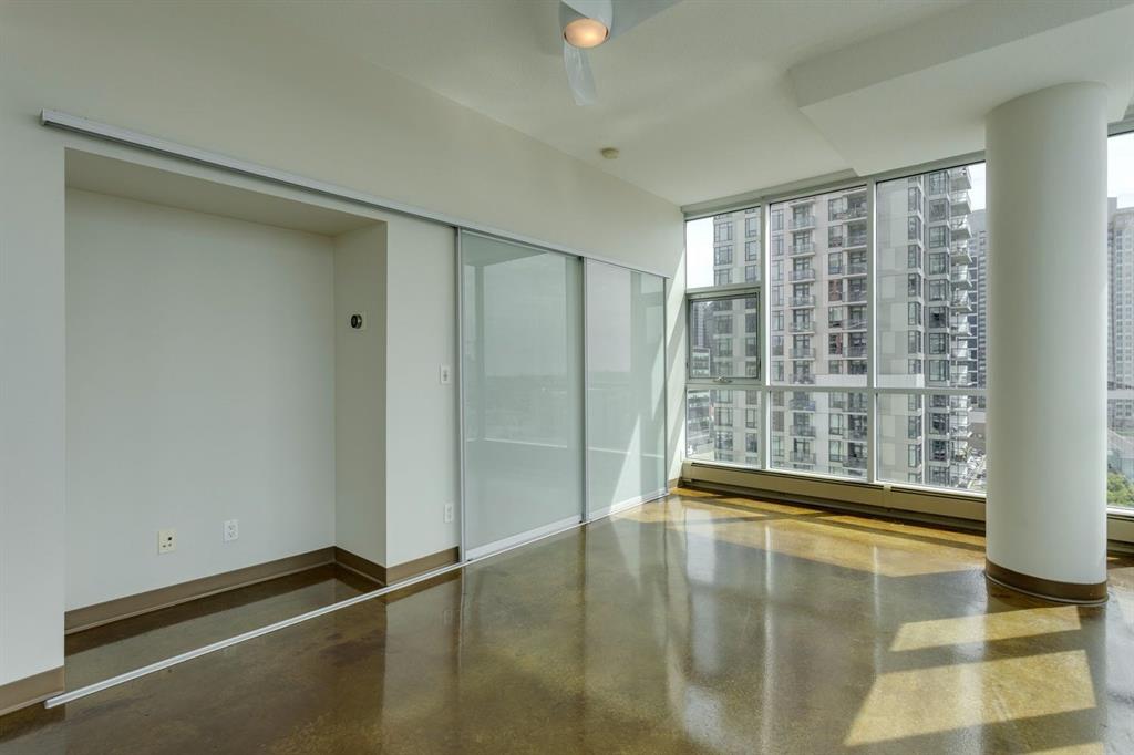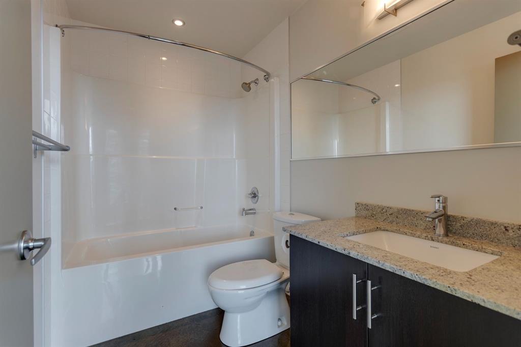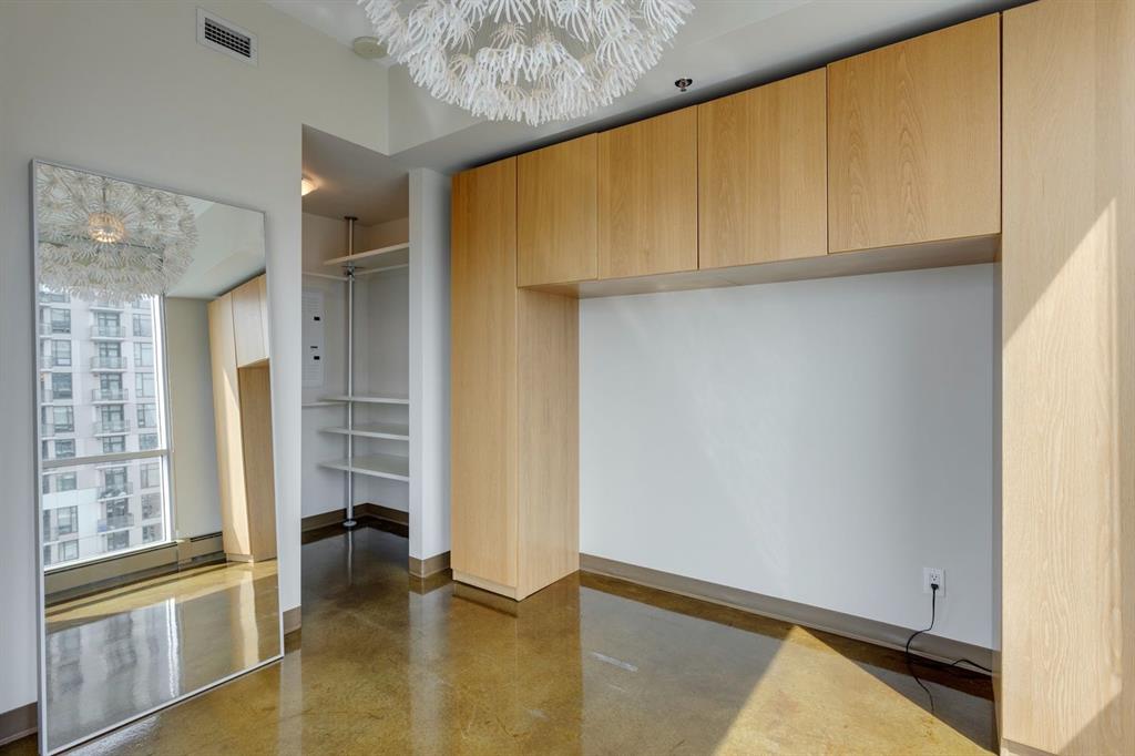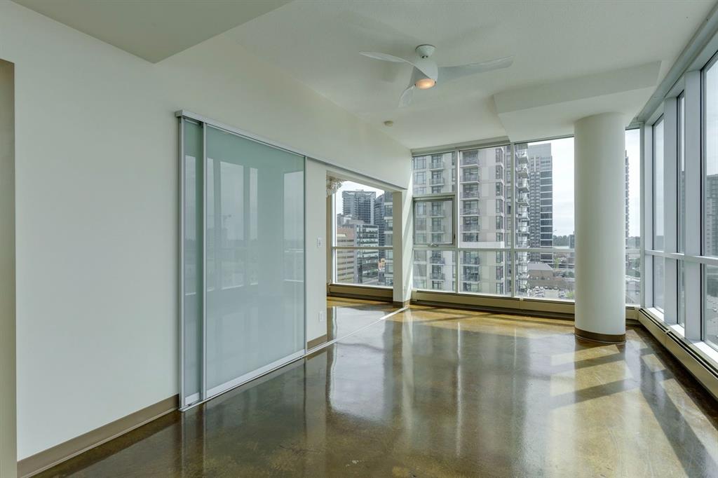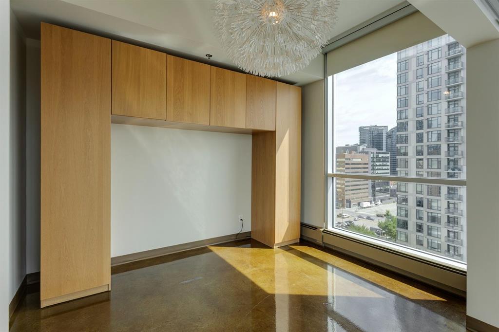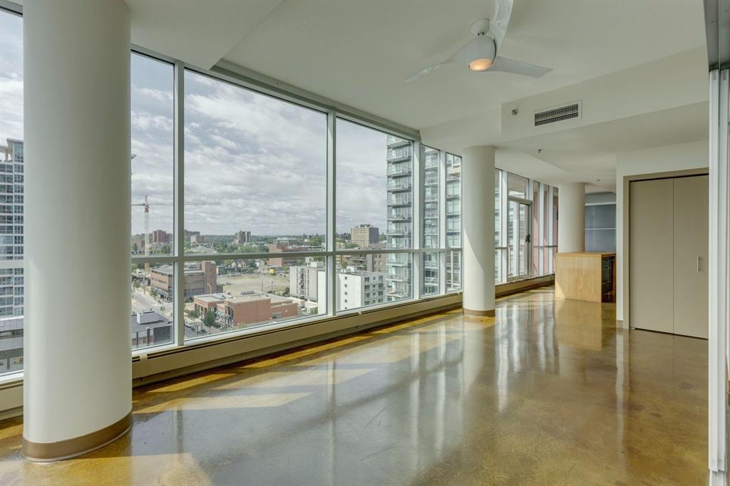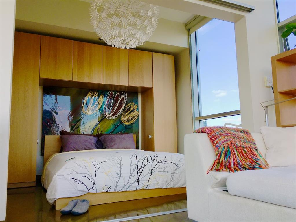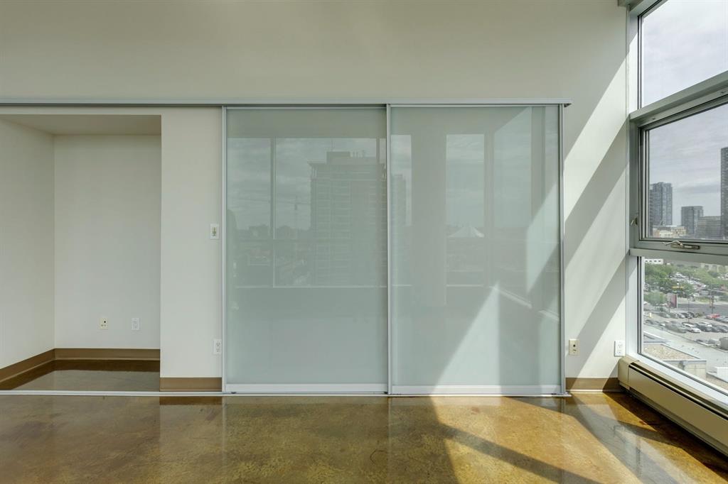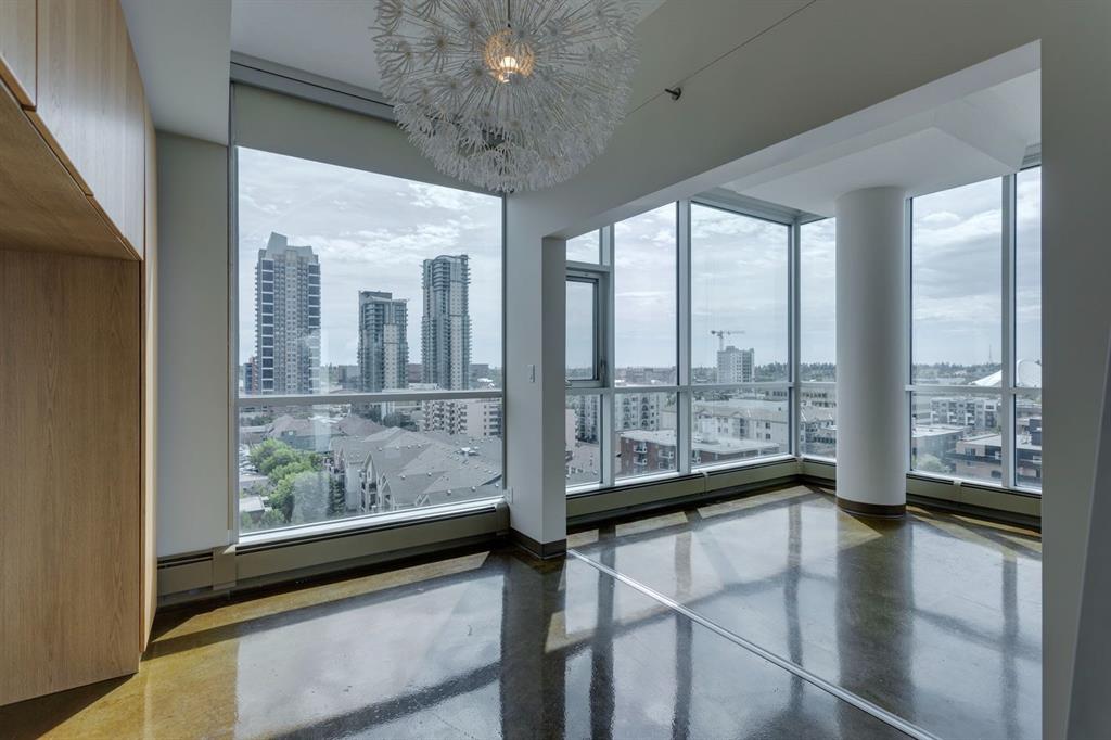 Discover downtown living at its best in this standout 1 bed/1 bath corner unit in Colours by Battistella, a striking high-rise known for its modern architecture and prime location. This unit delivers on space, style, and one of the most spectacular views in the city. Boasting floor-to-ceiling windows along two full walls, this home offers incredible 180 degree views of Stampede Park and the Rocky Mountains, filling the space with natural light all day long. The open concept layout creates a bright, airy feel, ideal for both everyday living and entertaining. The contemporary kitchen features granite countertops, stainless steel appliances, including a Miele dishwasher, and a central island with a butcher block countertop, blending form and function seamlessly. The kitchen flows effortlessly into the living and dining area, leading to a private balcony where you can enjoy morning coffee or evening relaxing with cityscape views. The spacious primary bedroom is framed by urban vistas and modern exposed concrete accents, adding a touch of industrial flair. A custom built-in storage unit enhances both style and functionality, while the walk-in closet adds generous storage space. The sleek and modern 4pc bathroom is conveniently located just steps from the bedroom. Additional features include in-suite laundry, titled underground parking, and secure building access. Located in the vibrant Beltline, you’re just steps from 17th Ave, 10th Ave, Stampede Park, top rated restaurants, cafes, shops, nightlife, and transit. Whether you’re a first time buyer, urban professional, or investor, this unit offers unmatched downtown lifestyle and value.