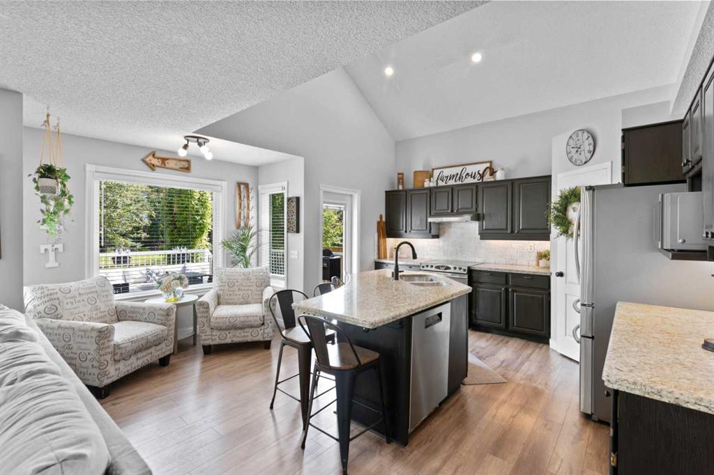 Step inside to soaring vaulted ceilings and durable laminate flooring throughout the main level. The open-concept kitchen, dining, and family room layout is ideal for everyday living and entertaining. The kitchen features granite countertops, stainless steel appliances, maple cabinetry, and a cozy breakfast nook with direct access to the south-facing backyard and large deck with Hot tub—perfect for sunny morning coffee or evening dips.