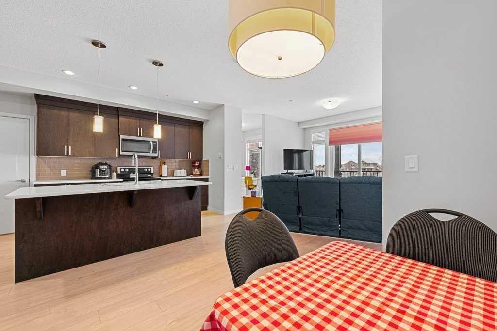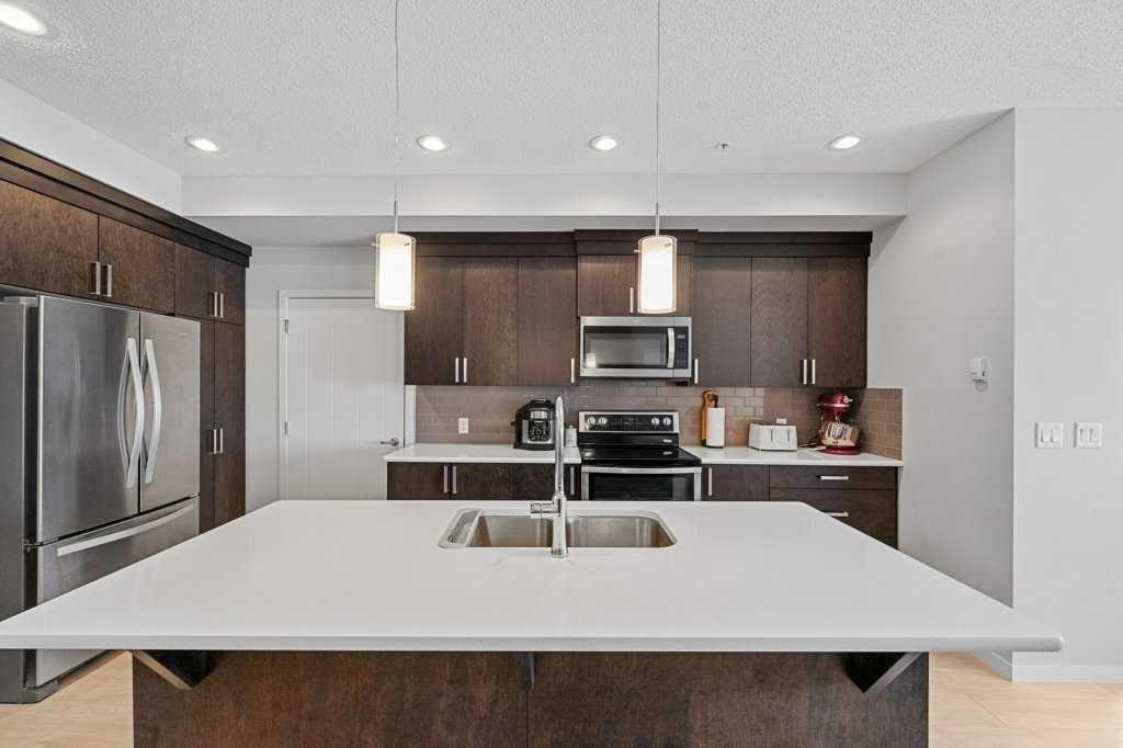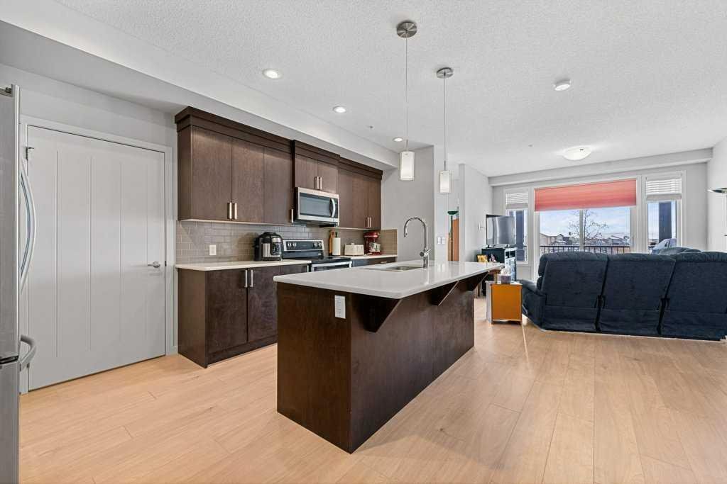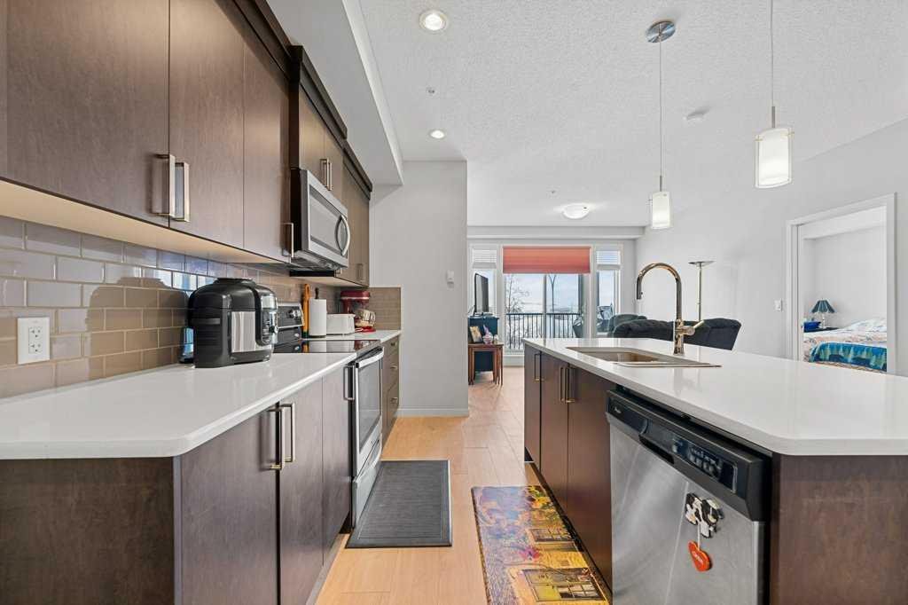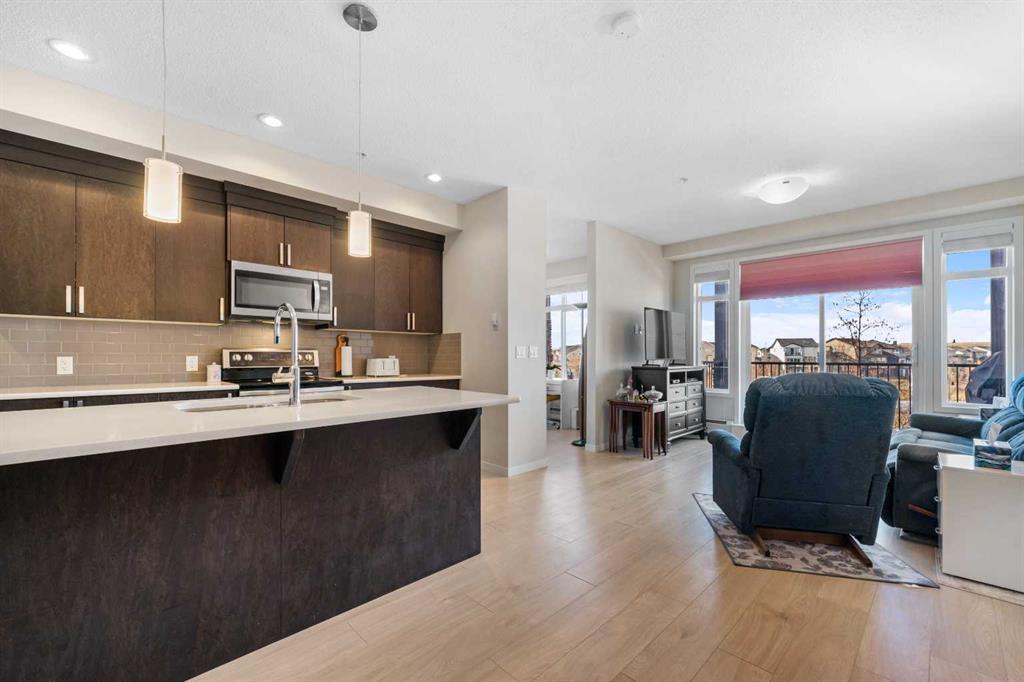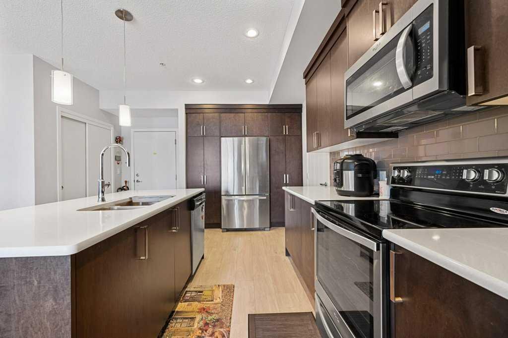 Welcome to “The Elements” a popular Cedarglen built, low maintenance lifestyle development in the amenity rich community of New Brighton. Community Centre, water park, winter ice skating, play parks etc. Close to the Hospital, shopping, restaurants, schools & Fish Creek Park. Express bus to City Centre. This unit has a fabulous location with views from every principal room & the spacious balcony of a beautiful wetlands park with paved pathways to stroll through nature & enjoy picturesque views. Inside you will discover an open, airy plan featuring 9-foot-high ceilings & loads of light flooding in thru numerous large windows. Enjoy low maintenance vinyl plank flooring. 2 spacious bedrooms plus a den, 2 full baths, in unit laundry & storage room. The massive kitchen offers a plethora of modern cabinets, quartz countertops, stainless steel appliances & a large island with sit up breakfast bar. The spacious kitchen is open to the dining & great rooms creating the perfect space for entertaining. This is the 3rd largest floorplan in the development plus it comes with two parking stalls & storage cage, very rare to get!
