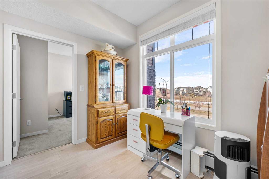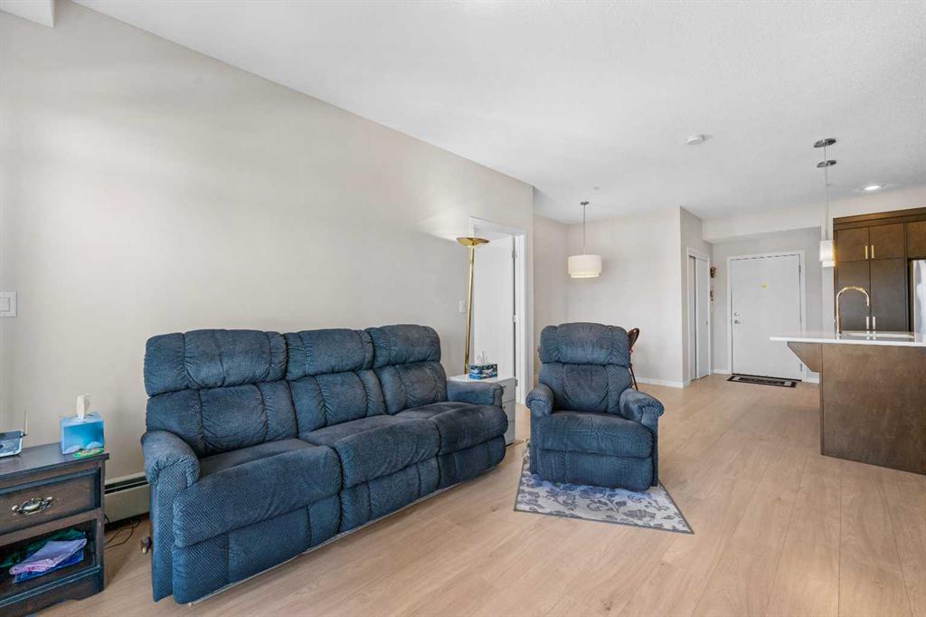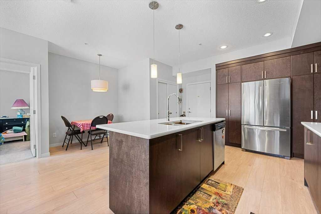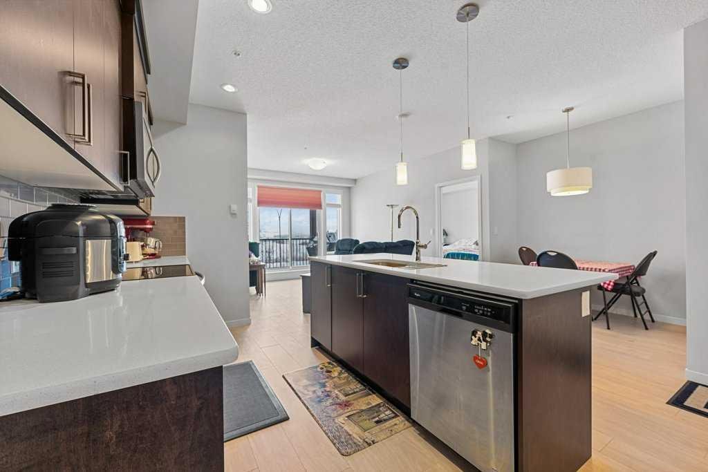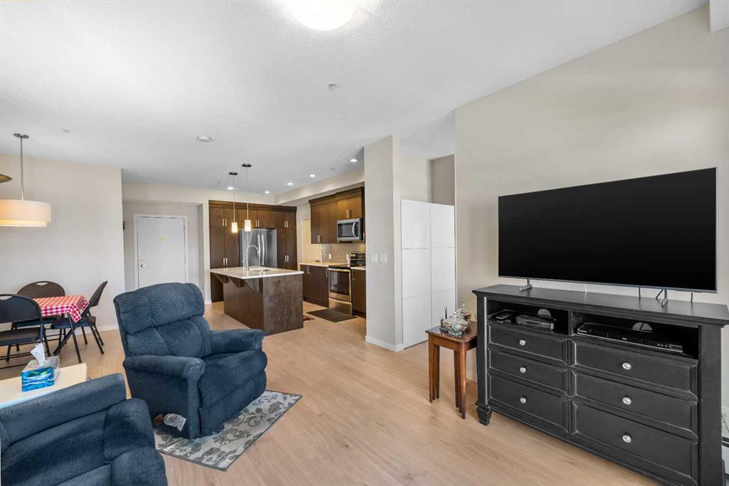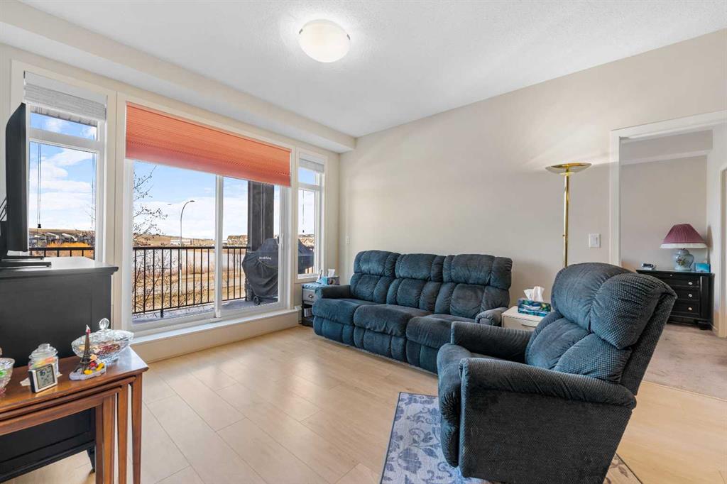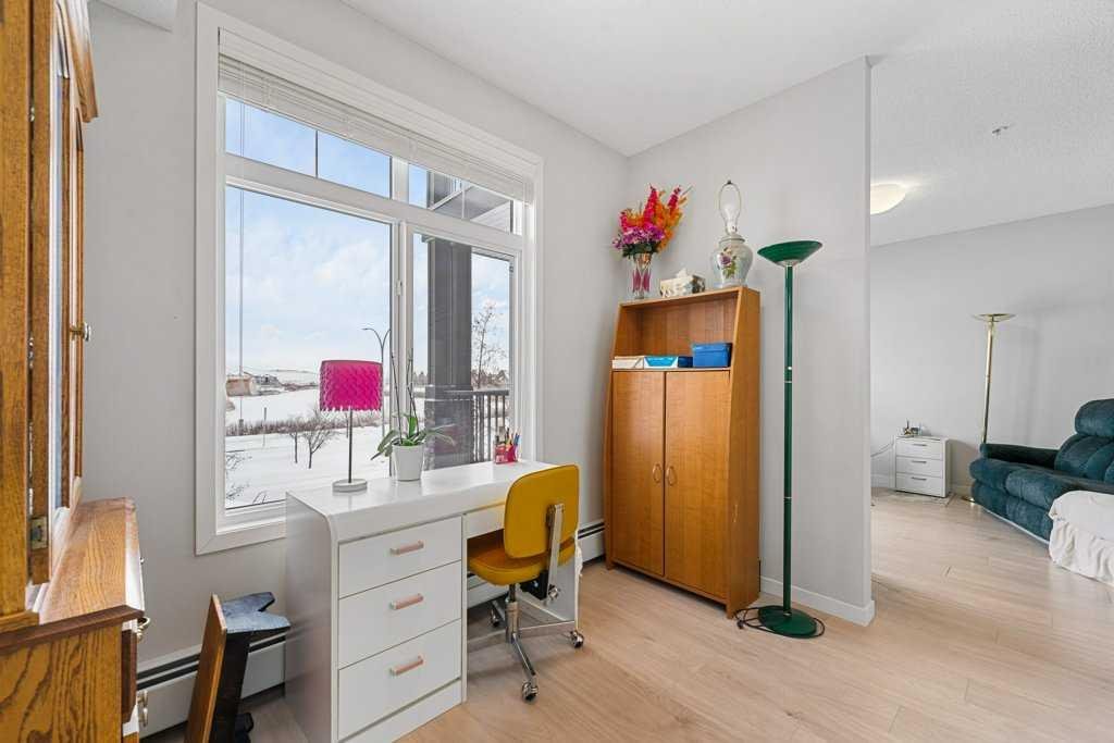 Welcome to “The Elements” a popular Cedarglen built, low maintenance lifestyle development in the amenity rich community of New Brighton. Community Centre, water park, winter ice skating, play parks etc. Close to the Hospital, shopping, restaurants, schools & Fish Creek Park. Express bus to City Centre. This unit has a fabulous location with views from every principal room & the spacious balcony of a beautiful wetlands park with paved pathways to stroll through nature & enjoy picturesque views. Inside you will discover an open, airy plan featuring 9-foot-high ceilings & loads of light flooding in thru numerous large windows. Enjoy low maintenance vinyl plank flooring. 2 spacious bedrooms plus a den, 2 full baths, in unit laundry & storage room. The massive kitchen offers a plethora of modern cabinets, quartz countertops, stainless steel appliances & a large island with sit up breakfast bar. The spacious kitchen is open to the dining & great rooms creating the perfect space for entertaining. This is the 3rd largest floorplan in the development plus it comes with two parking stalls & storage cage, very rare to get!