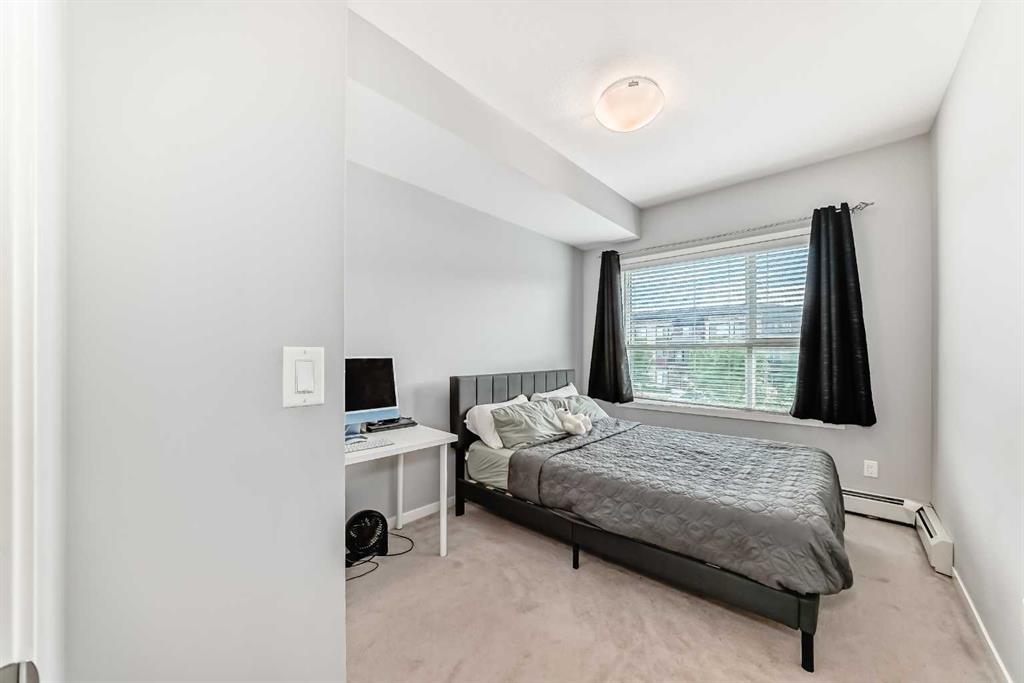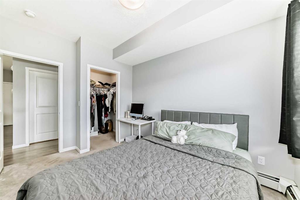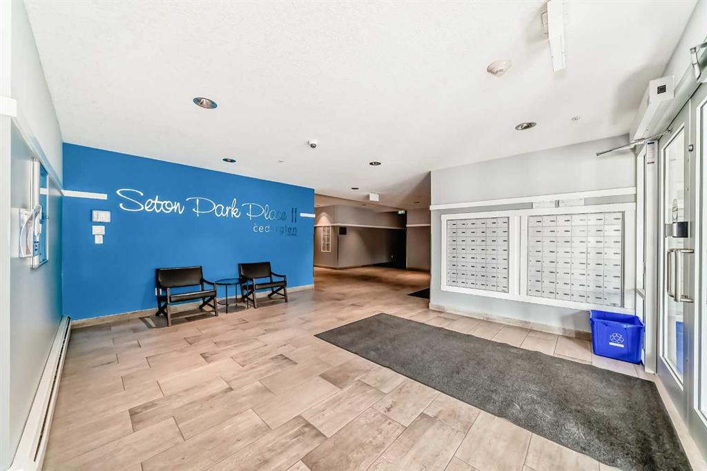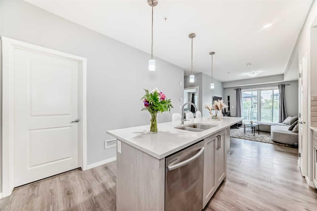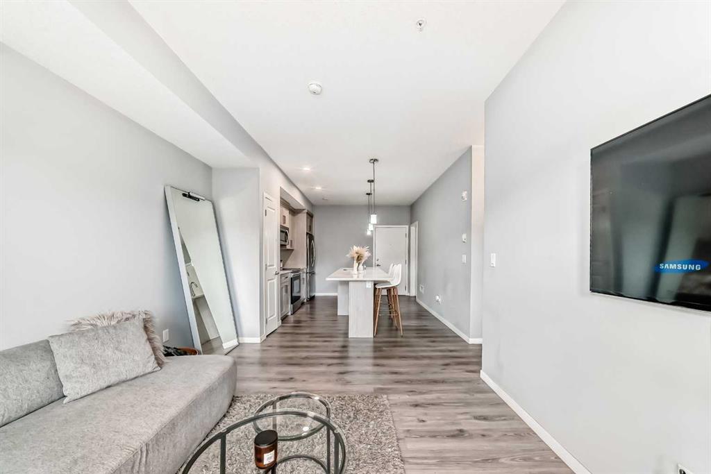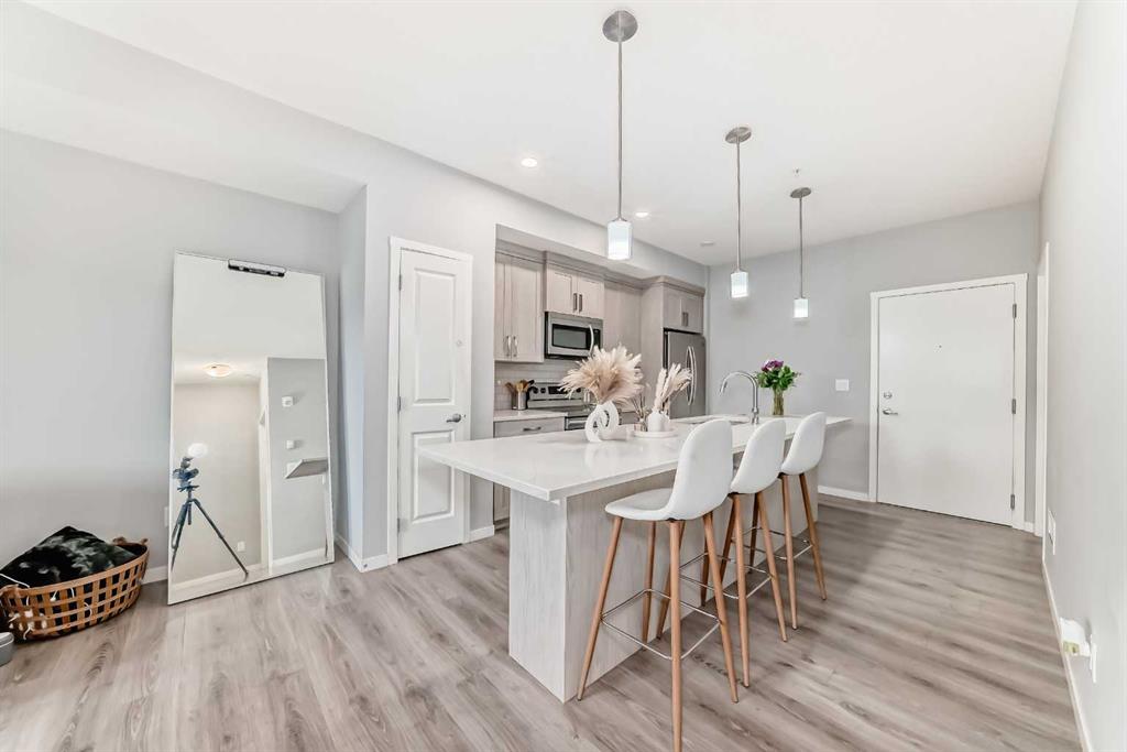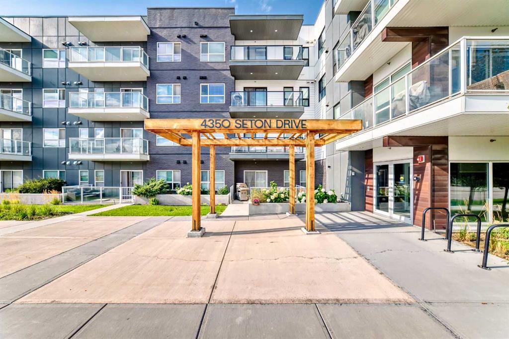 Welcome home to this beautiful condo in the popular & convenient community of Seton! This contemporary 1-bedroom, 1-bathroom unit features a well appointed kitchen with stainless steel appliances, gleaming quartz counters and a huge island with space for seating, a dedicated pantry, tall kitchen cupboards and hanging pendant lights. You will love the open concept living as the eat-in kitchen connects you to the spacious living room making entertaining guests a pleasure. There is also a private south-facing balcony which brings in lots of natural light. The generous sized bedroom also has a walk-in closet. Directly across from the bedroom is a lovely 4-pc bathroom. You will also have the convenience of a large in-suite laundry room with tons of additional storage. One underground titled parking is included along with a separate storage room also located underground. This building is PET FRIENDLY with board approval. Seton offers many amenities including Calgary’s newest hospital, the South Health Campus, Calgary Public Library & the world’s largest YMCA. Other amenities include restaurants, grocery stores, schools, Cineplex and community parks! Do not miss your chance to make this gorgeous condo in an ideal location your next home!