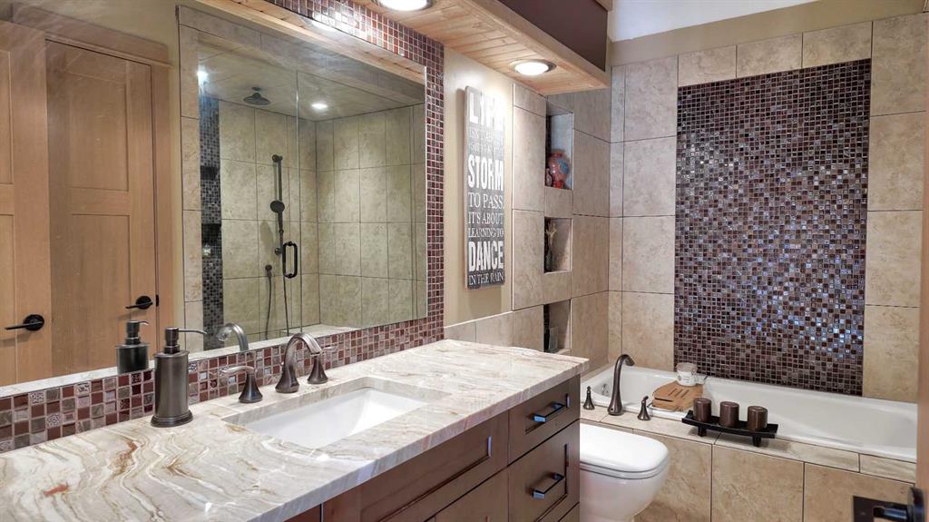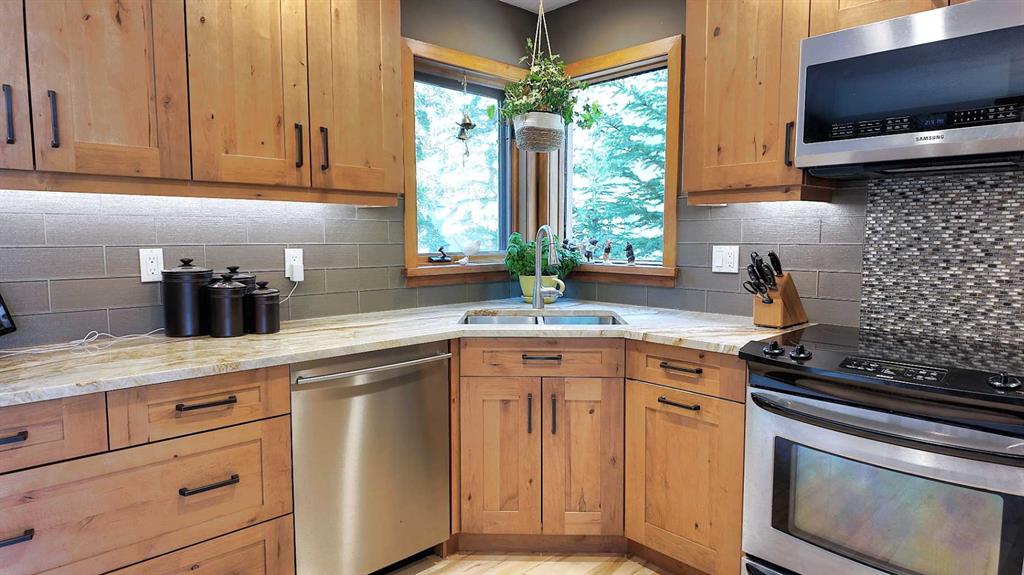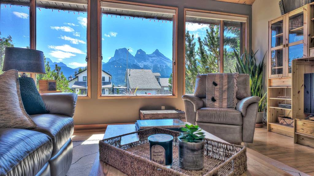 Experience the best of Canmore living in this beautifully maintained 5-bedroom + den home, perfectly positioned for unobstructed views of the iconic Three Sisters peaks. Featuring hardwood floors throughout the main and upper levels, heated bathroom floors, a landscaped backyard with pond and outdoor firepit, plus a legal 1-bedroom basement suite with large storage room, this property offers comfort, style, and versatility.