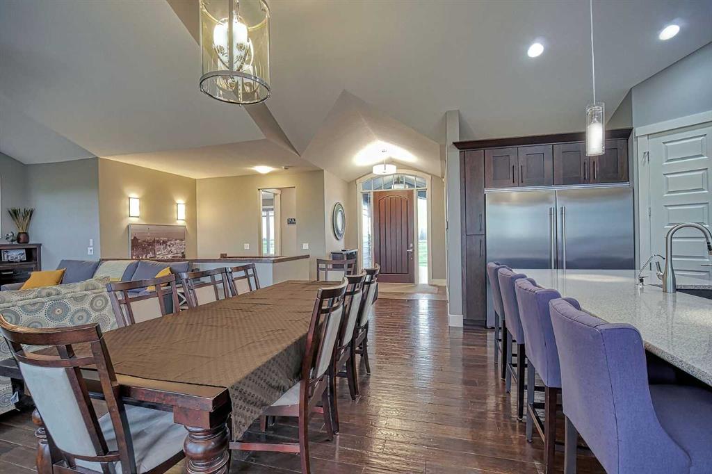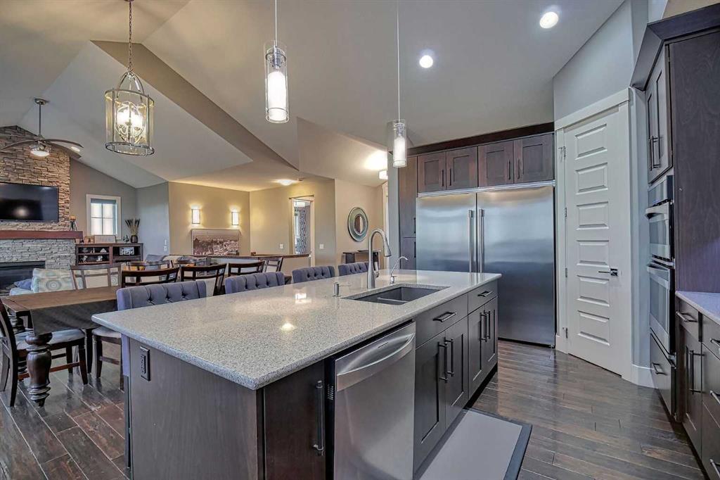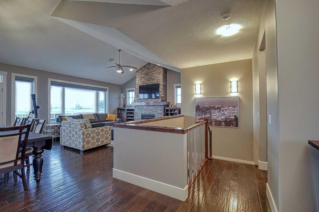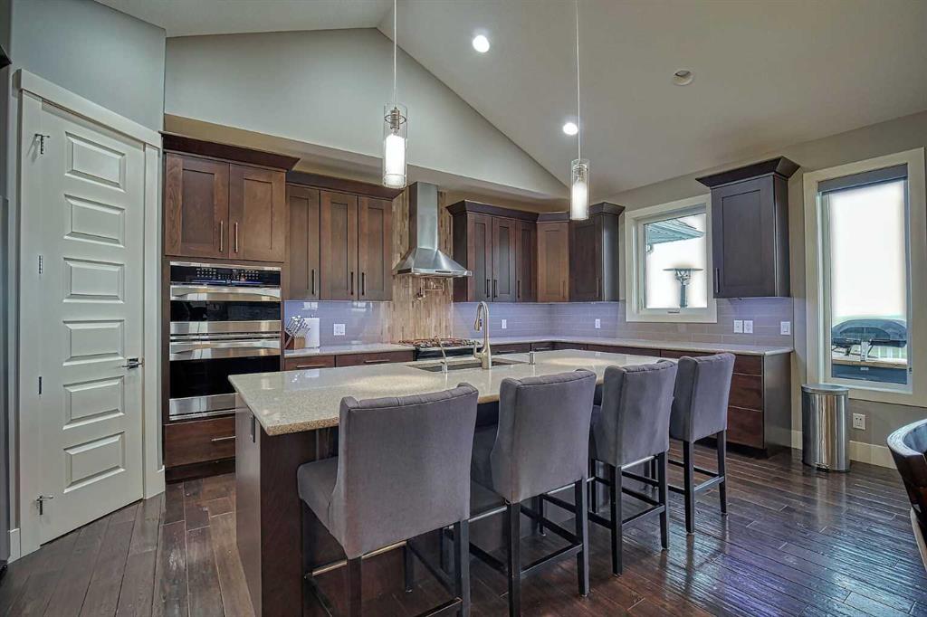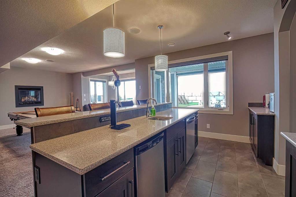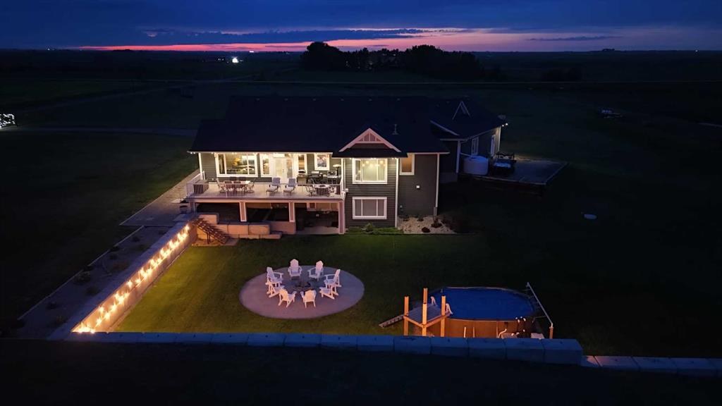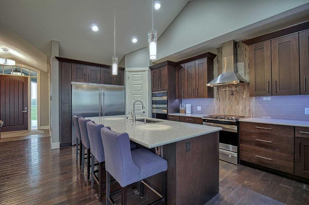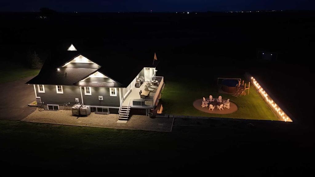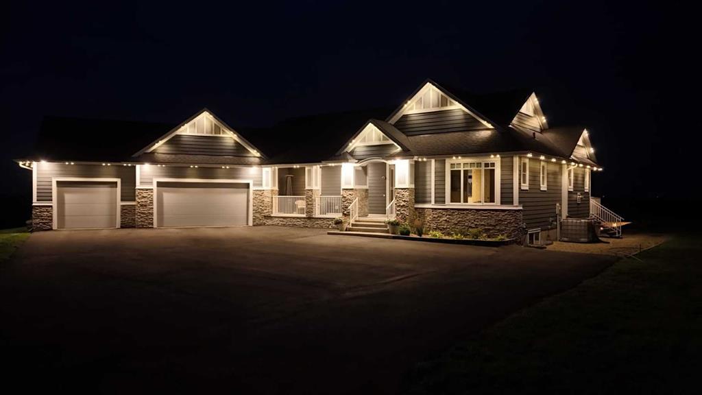The built-in fridge and freezer combo is a generous in size, complemented by two ovens including a built-in microwave, a gourmet gas range with another oven, and a convenient pasta faucet. Hand-scraped hardwood floors add sophistication while maintaining a cozy, farm-inspired feel.This thoughtfully designed kitchen offers expansive quartz counters, abundant cabinetry, and a hidden gem — a walk-through butler’s pantry, providing even more space for your culinary essentials. Double doors open to a spacious deck, perfect for lively gatherings or quiet evenings soaking in the peaceful farm views. In the primary suite, expansive windows frame the rolling landscape, making the view a part of the room itself. A gas fireplace flickers warmly on cooler nights, while a French door leads you directly to the patio for a breath of fresh country air. The luxurious 5-piece ensuite offers a spa-like retreat — a deep soaker tub set beside the fireplace invites indulgent baths, while double sinks, a generous walk-in shower with built-in seating, and a private water closet provide both comfort and function. The grand walk-in closet offers ample space to keep everything perfectly organized. The Main floor features a second bedroom that provides guests or family with their own retreat, complete with a walk-in closet and an elegant 4-piece ensuite. The hall area includes a 2-piece bath, organized laundry room, and mudroom. Downstairs, a media room with a 135” screen and 4K projector is perfect for movie nights. There’s also space for a pool table (negotiable), poker table area and a full wet bar with quartz counters, sink, dishwasher, beer keg with tap, wine storage, and a commercial beverage fridge. This level has two bedrooms with walk-in closets, a 4-piece bath, and a walkout to a covered patio with hot tub, heated above-ground pool, and fire pit. A massive retaining wall ensures privacy, and a shed provides garden storage. There are underground sprinklers. Included are 22 built-in speakers with Control 4 automation, five TVs with mounts, projector and screen & cameras. Come experience Executive Country Living.