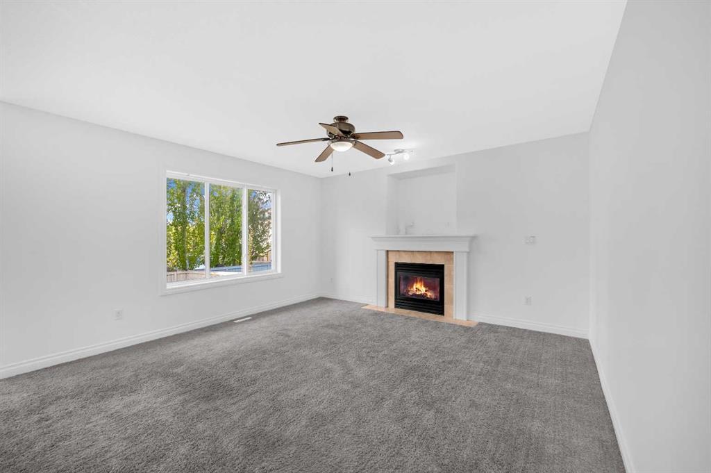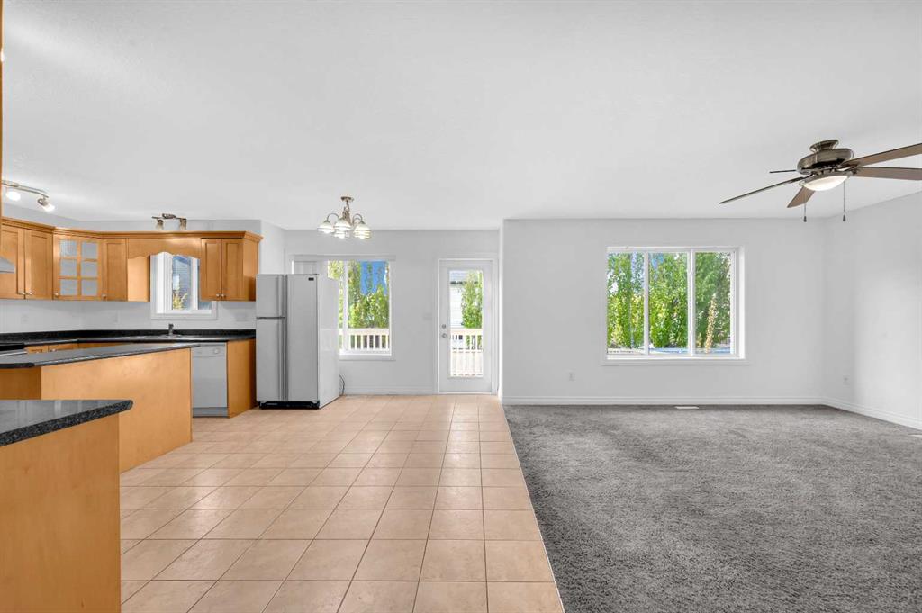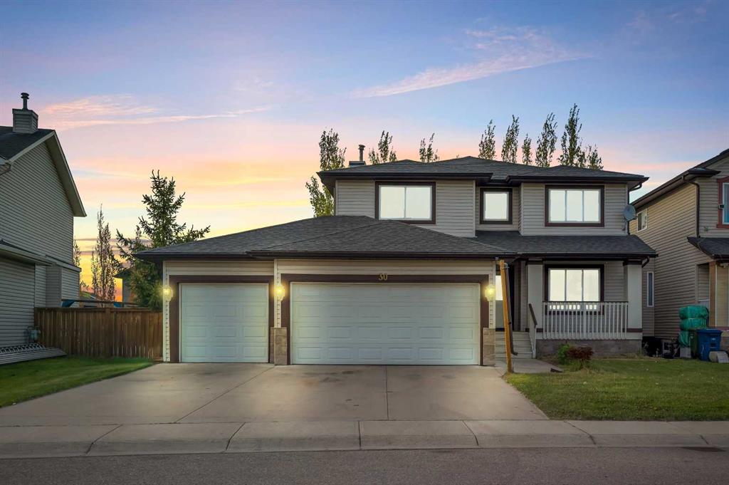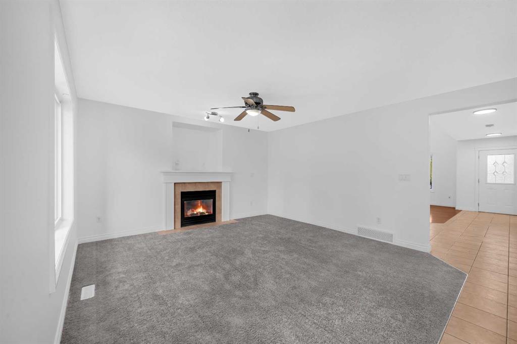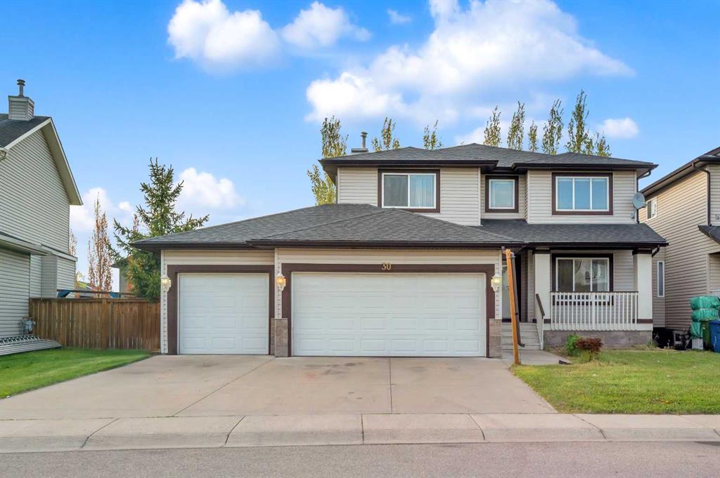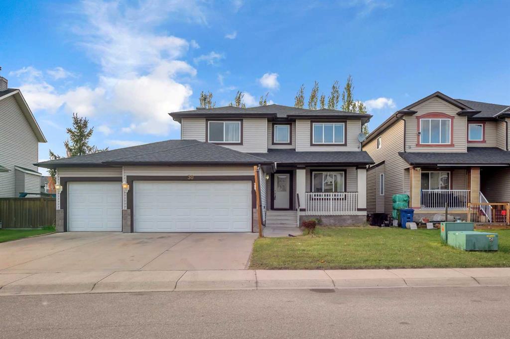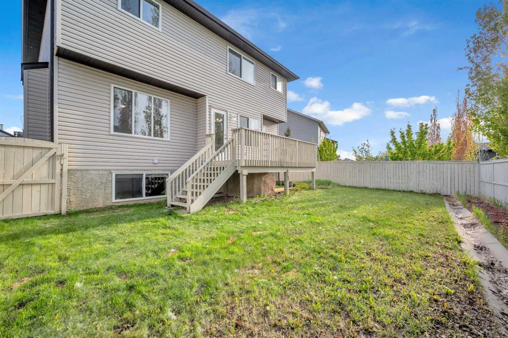 Welcome to this beautifully maintained 2-storey home with a triple-car garage and total parking for 6 vehicles, located in the sought-after community of Canals in Airdrie. This open-to-below floor plan features large windows, hardwood and tile flooring, a spacious kitchen, and a cozy living area with a gas fireplace. A main floor bedroom with a full bathroom adds convenience and flexibility. Step out from the dining area to a large, private landscaped backyard with a good-sized deck — perfect for outdoor living.