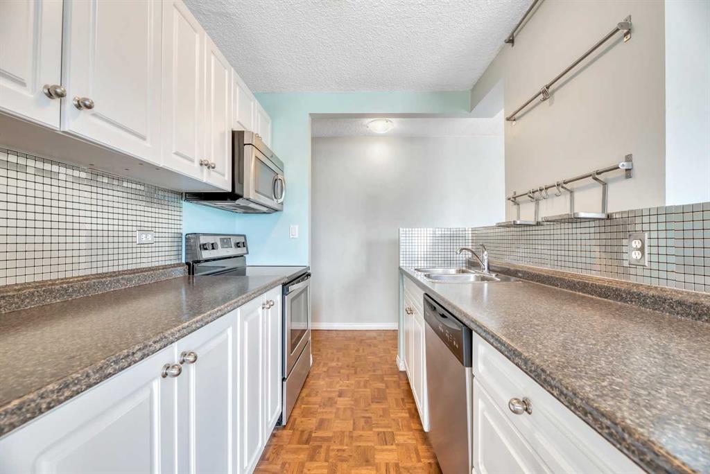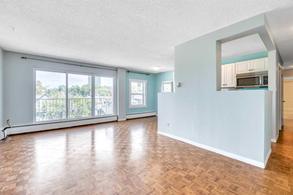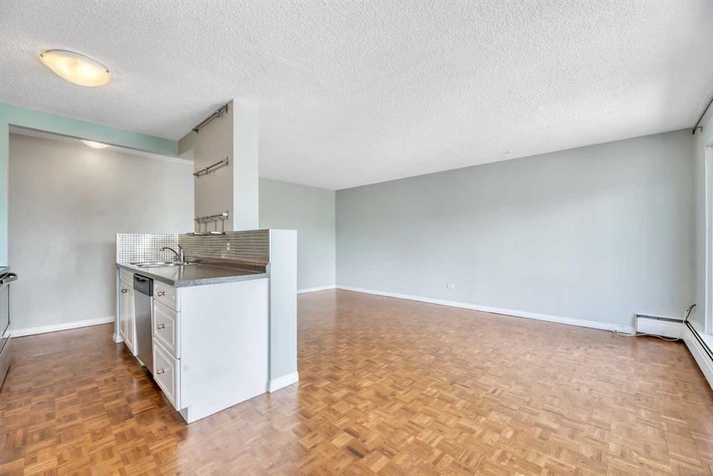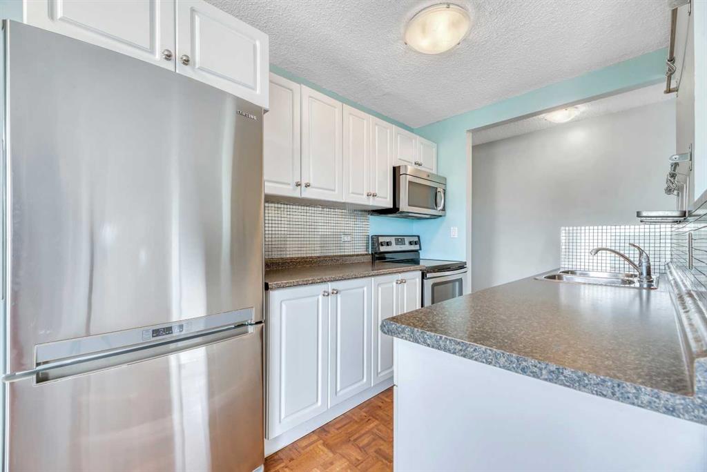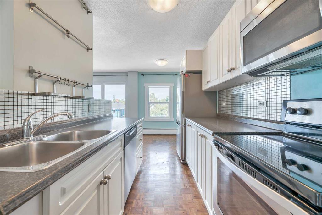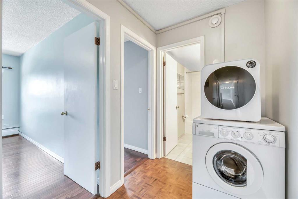 Attention Investors & Savvy Property Buyers – don’t miss out on this RARE OPPORTUNITY! Welcome to unit #403, a TOP FLOOR CONDOMINIUM in the complex of “Hardwood Green”! This CONCRETE CONSTRUCTION 18+ adult building is located in the vibrant, highly walkable, inner-city community of Sunalta! This beautifully RENOVATED top-floor condominium boasts 811 SQUARE FEET of bright, stylish living space, in a QUIET concrete constructed building, and features 2 LARGE BEDROOMS, 1 FULL BATHROOM, a spacious COVERED BALCONY, IN-SUITE LAUNDRY and STORAGE ROOM, and an ASSIGNED PARKING STALL (#27, with plug-in). This condominium unit has been tastefully updated in recent years and boasts a modern white kitchen with newer stainless steel appliances, real hardwood flooring, and fresh paint throughout. The building has also undergone extensive upgrades, including a secure fob entry system, vinyl windows and siding, new balconies and railings, a new roof, a central boiler system, and the modernization of common areas and hallways. Convenience abounds with additional shared laundry room in the basement, and condo fees here include heat/fresh water/waste water utilities. Just steps away from Calgary’s best amenities: endless inner-city shops/retail/restaurants, transit (Sunalta C-Train Station – just a 5 minute walk!), the Bow River, and various parks and pathways, and the downtown core is also within easy reach. Don’t miss out, call today!