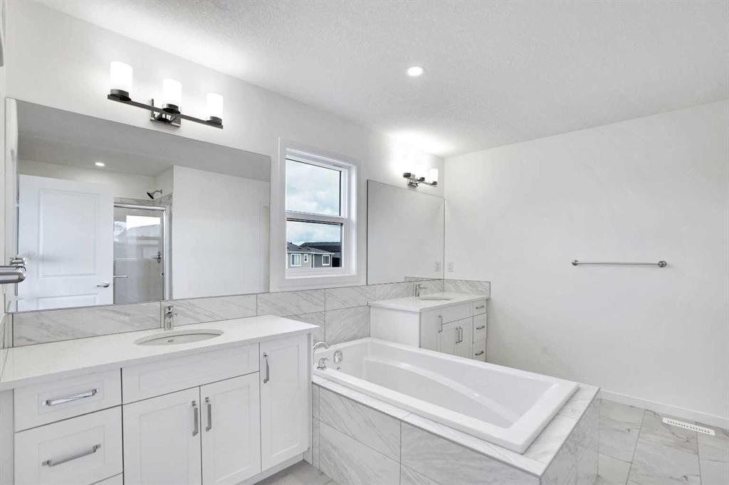 • Luxurious primary suite with walk-in closet and spa-like 5-piece ensuite: tiled soaker tub, dual vanities, and separate shower.