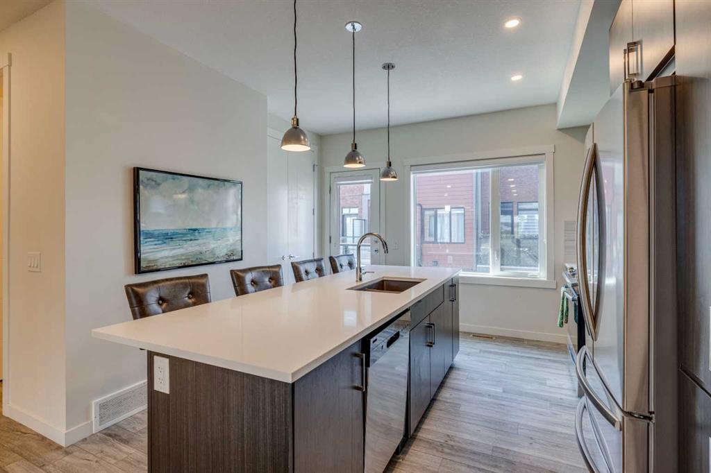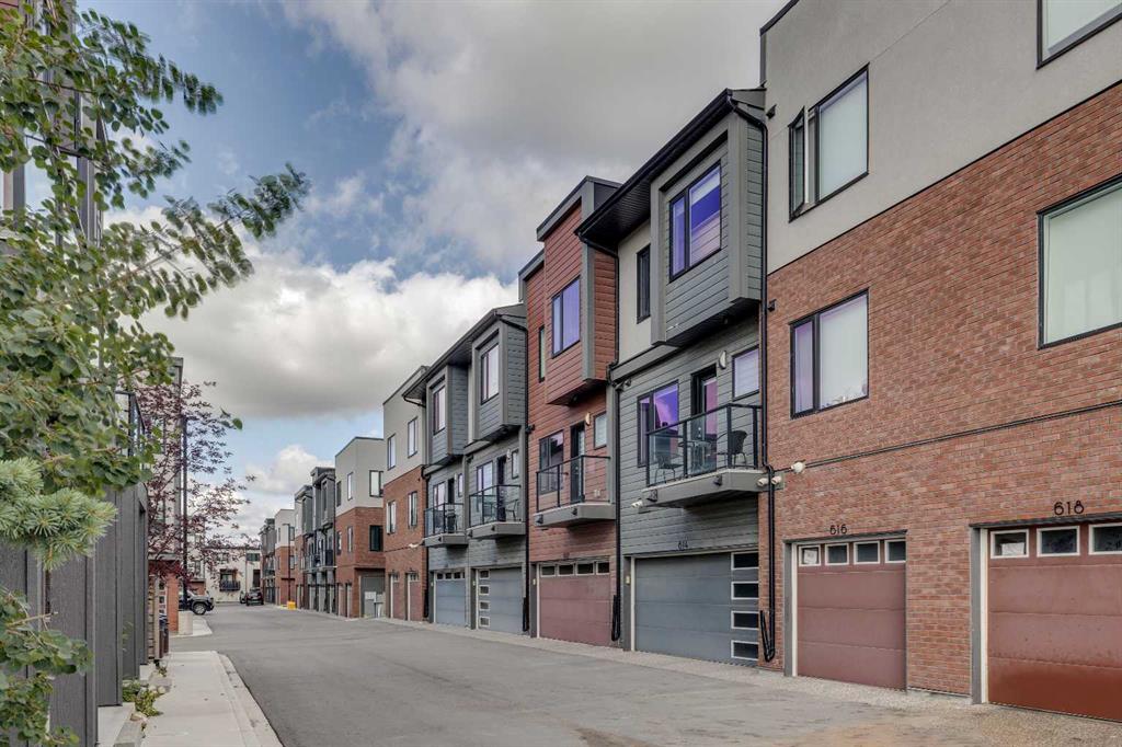 Welcome to 614 Greenbriar Common NW – a quality-built Calla model townhouse by Landmark Homes, located in the vibrant master-planned community of Greenwich. Built in 2020, this 4-bedroom, 3.5-bath home offers over 1,500 sq. ft. of thoughtfully designed living space across three levels. The entry-level features a private fourth bedroom with its own ensuite—ideal for guests, a home office, or multi-generational living. Just off the attached two-car garage, a convenient mudroom/entry makes daily life easy and organized. Upstairs on the main (second) floor, you’ll find a bright, spacious open-concept layout combining the kitchen, living, and dining areas—perfect for both relaxing and entertaining. The modern kitchen includes a large island with seating for four, quartz countertops, and 9’ ceilings, which continue throughout the home. A powder room and separate laundry room on the main level add to the functionality of the space. Abundant natural light flows in through large windows and glass doors that lead to balconies on both the front and north-facing sides. Enjoy expansive, unobstructed views over the river valley toward northwest Calgary. The top level includes three generously sized bedrooms, including a primary suite with a walk-in closet and ensuite featuring a large shower. A four-piece main bath serves the other two bedrooms. This townhouse is tucked away at the back of the community, offering peace and quiet, yet remains close to everything. Just steps away is Canada Olympic Park for skiing and recreation, and nearby you’ll find shopping, restaurants, and coffee shops. The new Calgary Farmers’ Market West, boutique retail, and dining options are all within walking distance. Commuters will appreciate quick access to 16th Ave NW/Hwy 1, providing a straight route downtown to the east or westward to the Rocky Mountains, Banff, and Canmore. Proximity to Foothills Hospital, Children’s Hospital, and the University of Calgary adds even more convenience. Other highlights include walking distance from the off leash dog area, energy-efficient heating, air conditioning, and triple-pane windows for year-round comfort. The home is in excellent condition and still covered by some of the AB home warranty program. Ideal for families or investors seeking a four-bedroom layout with attached garage parking. Don’t miss your chance to own this well-located home in a growing, lifestyle-rich community. Book your showing today!