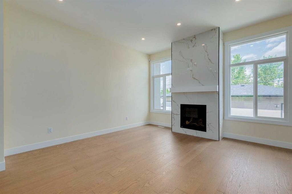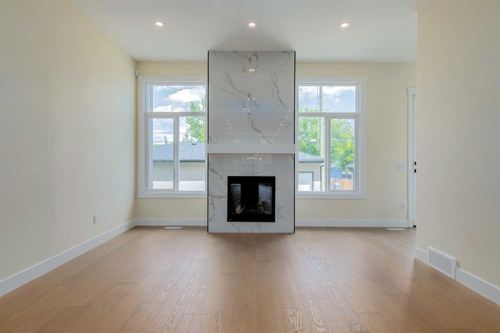 The adjacent living room is inviting and refined, featuring a statement fireplace framed by large windows that fill the space with natural light and offer a lovely view of the backyard. It’s the perfect balance of cozy and modern—great for hosting or relaxing after a long day.